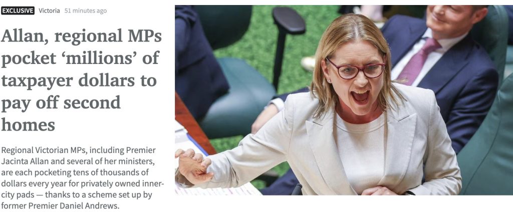 Whilst Victorian Fire Services are on life support with massive issues risking the lives of everyone due to the service being horribly underfunded and Victorians pay an extra $5billion in an ’emergency services tax with most people and families struggling to make ends meet’, Jacinta Allan has pocketed over $290,000 for her ‘city residence’ 2nd home allowance and Jaclyn Symes who lives only 89 kilometres from Parliament Houses has to date pocketed $251,956 to pay for her Collingwood Pad! This is truly insulting too all decent hard-working Victorians and really is setting a standard beyond the pale!