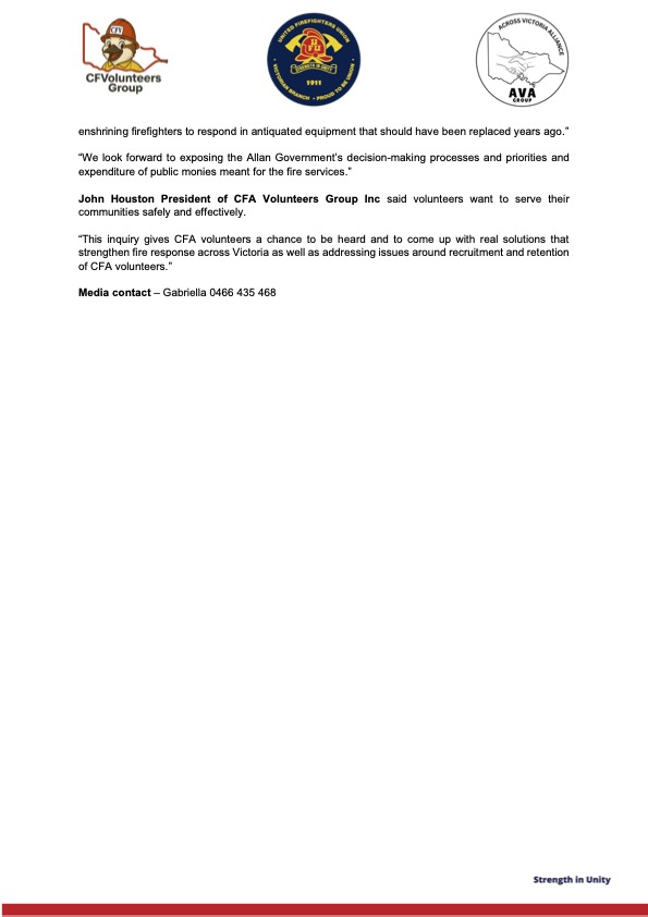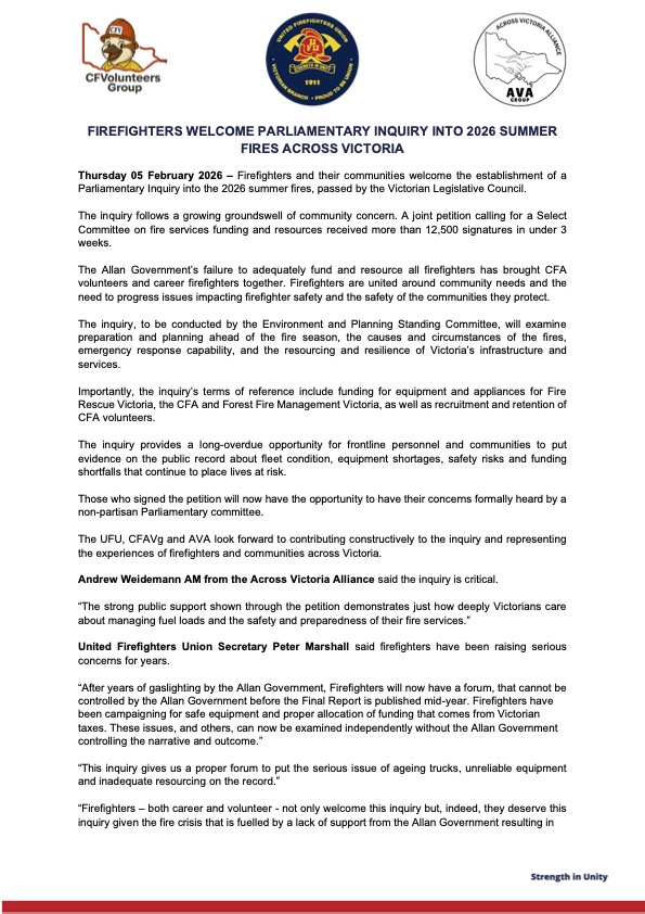 MEDIA RELEASE: FIREFIGHTERS WELCOME PARLIAMENTARY INQUIRY INTO 2026 SUMMER FIRES ACROSS VICTORIA