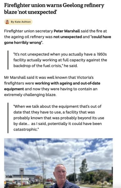 UFU Warns Geelong Refinery Fire ‘Not Unexpected’