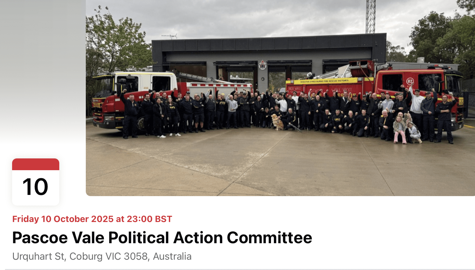 Members of the United Firefighters Union (UFU) will be gathering at the Coburg Civic Centre this Friday 10th October to demand accountability from their local MPs and urge the Allan Government to take immediate action on critical safety and resourcing issues. Firefighters are dedicated to protecting Victorians — but they can’t do that safely without the right support. The Allan Government must step up and deliver the resources and respect our firefighters and our communities deserve.