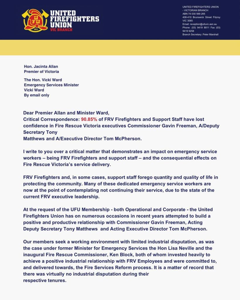 91% have No Confidence in FRV Leadership! Letter to the Premier and Minister!