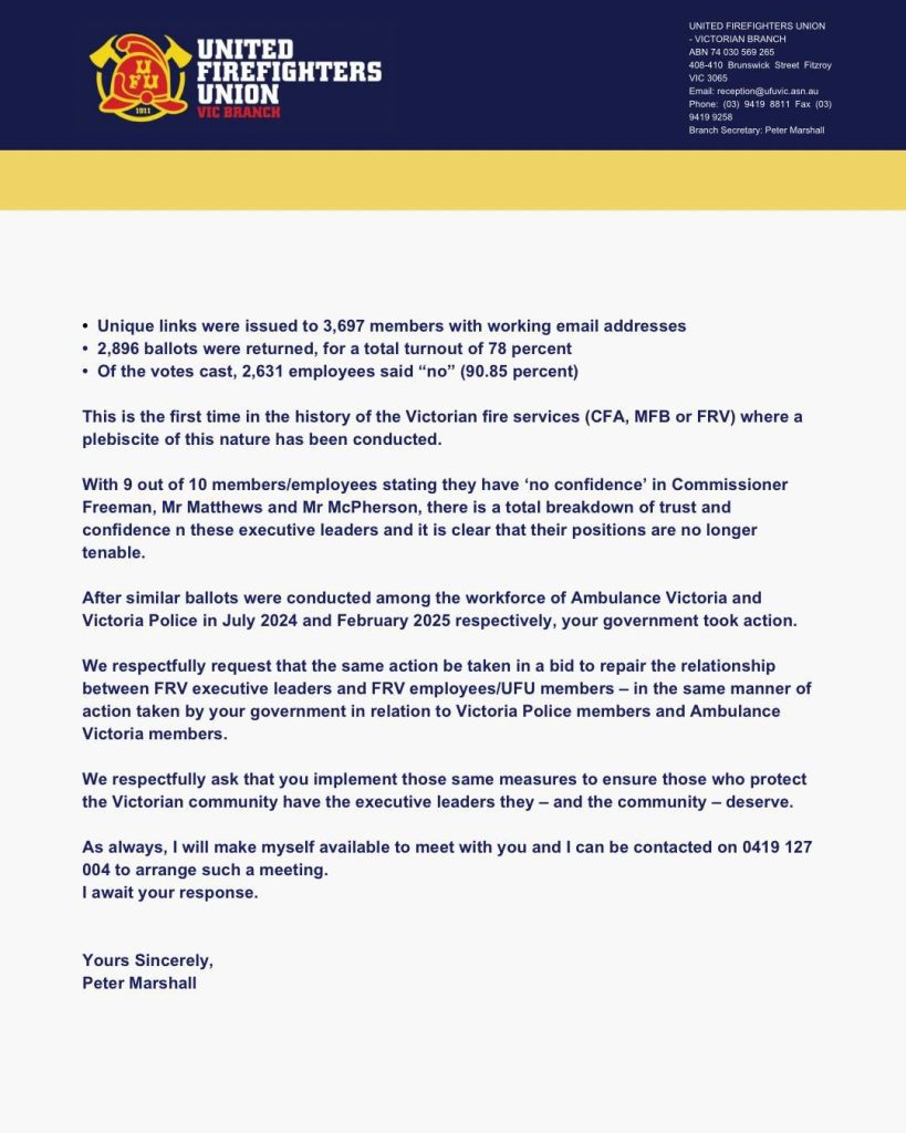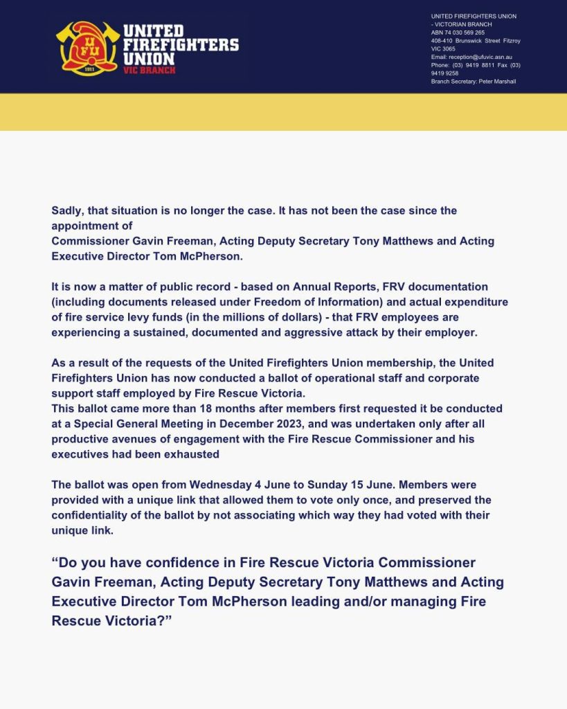 Victorian Firefighters have delivered an Overwhelming Vote of No Confidence in Fire Rescue Victoria’s leadership!
